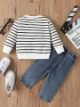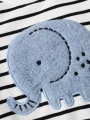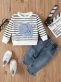 2pcs Infant Baby Boy Cute Striped Elephant Pattern Long Sleeve Top & Denim Trousers Outdoor Set For Spring And Autumn